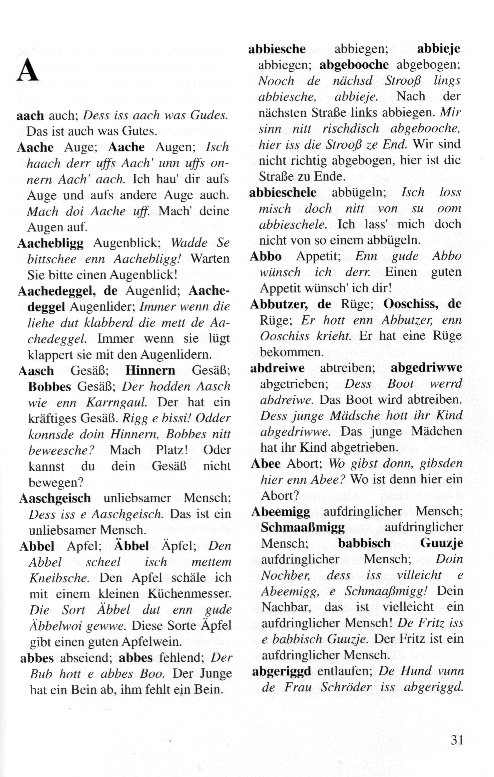 Beim Wörterbuch geht es nicht nur um die selten in den Mund genommenen Wörter wie "Umitz" für Ameise und "Schessmelle" für Unkraut - nein, es soll großen Wert gelegt werden auf Wörter wie "Werrt" für Wirt, "laafe" für laufen, "hoom" für heim und "Dippe" für Topf. Wir meinen, dass es gerade daran fehlt, nämlich an den Wörtern für die Sprache des täglichen Gebrauchs.